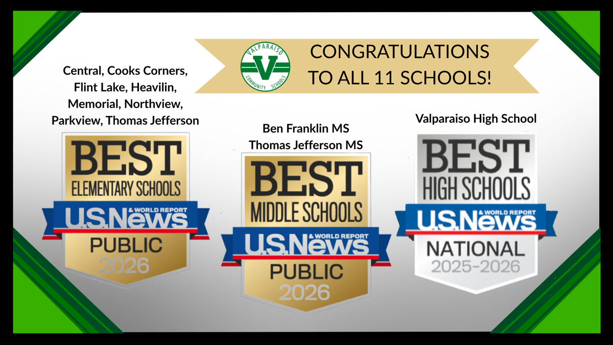 Congratulations to all Valparaiso Schools for earning the U.S. News & World Report’s distinguished designation as the top 2026 Best Elementary Schools, 2026 Best Middle Schools, and 2025-2026 Best High Schools.